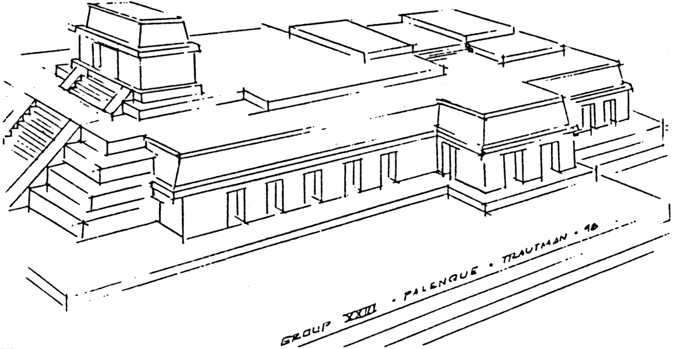 Dibujo reconstructivo del Templo XXIII, hecho por David Trautman.