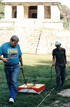 Roger Helmandollar and Julian Antonio de la Cruz dragging GPR transponder across Stephens Plaza.