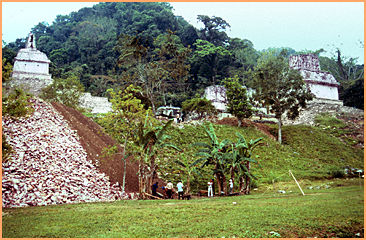 The dirt on the hillside in this misty morning view comes from excavations on the west side of the Temple of the Cross during the 1997-1998 season.