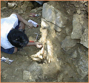 Restoration expert, Juan Alfonso Cruz, excavating stucco glyphs from Temple XIX. (Photo: Alfonso Morales.)