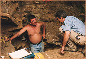 Alfonso Morales and Christopher Powell confer on the excavation of the glyphs and stucco panel.