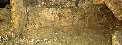 The stone carving is low relief, intricately detailed, and nearly perfectly preserved. Only the lower portion of the carved stone tablet remained in situ.