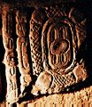 | This glyph, read k'inich-janahb'-pakal / k'inich janahb' pakal, is the name of K'inich Janahb' Pakal (Pacal the Great). In this version, the element that Thompson referred to as the "propeller" (actually a type of flower called janahb') is infixed in the pakal shield. See Janahb' note. |