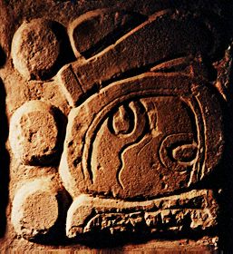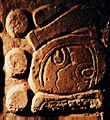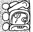 | This glyph, together with the bird glyph that follows it, is the head variant of the ch'ok name (pre-accession name) of K'inich K'an Joy Chitam II (Kan Xul II). See "Ox Ch'akaban" note. |