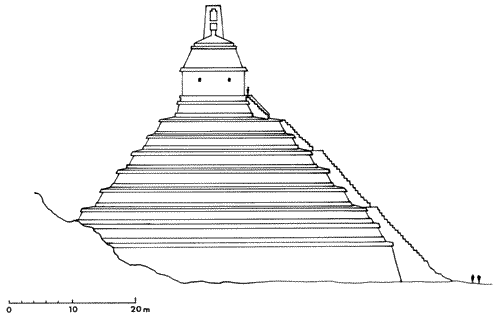 The Temple of the Inscriptions: east elevation. The first building phase. Drawing by Merle Greene Robertson, from Alberto Ruz Lhuillier 1973, fig. 295b.