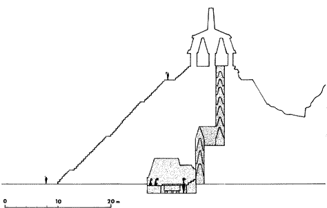 Vaulted stairway within the temple. The vault and stairway remained unchanged throughout Palenque's history. Drawing by Merle Greene Robertson, modified after Alberto Ruz Lhuillier 1952, 1973.