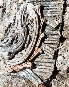 House A-D. Serpent wing has red border feathers, blue serpent outline and yellow crosshatched area painted over blue.