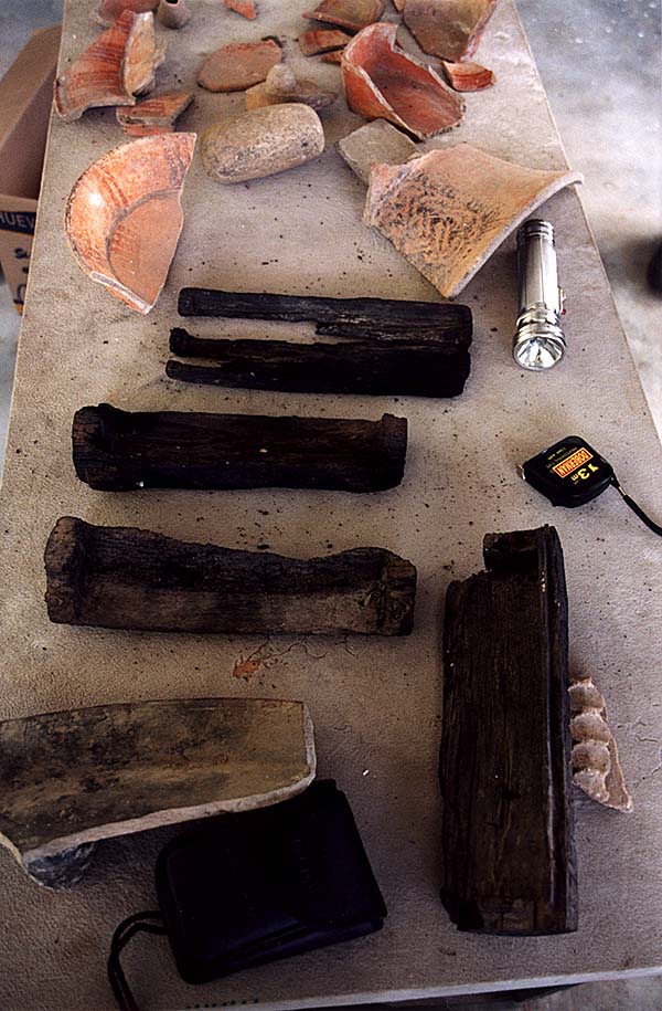 The inscribed wooden box is at the lower right in this photograph. The other three pieces (center) belong to a plain wooden box. Also on the table are ceramic shards.