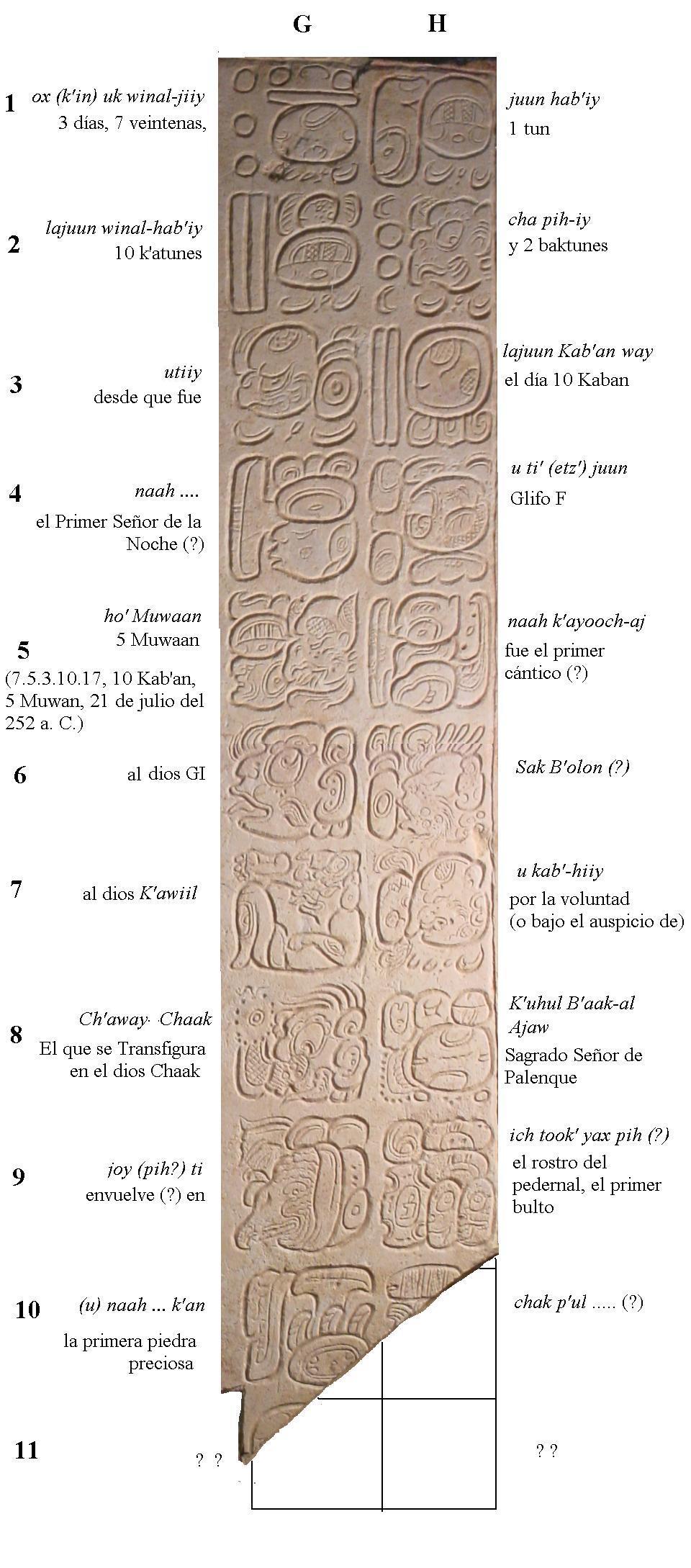 Temple XXI Tablet, glyphs G1-H11: reading by Guillermo Bernal Romero